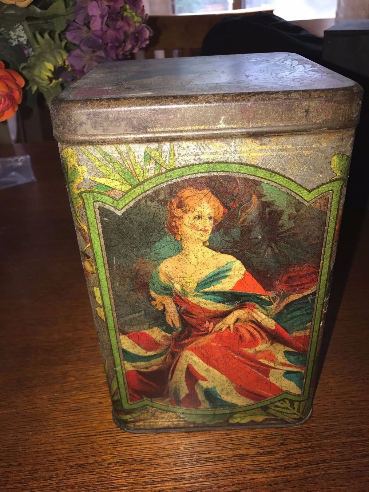 Title (ebay affiliate link): Antique Biscuit Tin United Kingdom Coat of Arms Ladies Flag Dresses