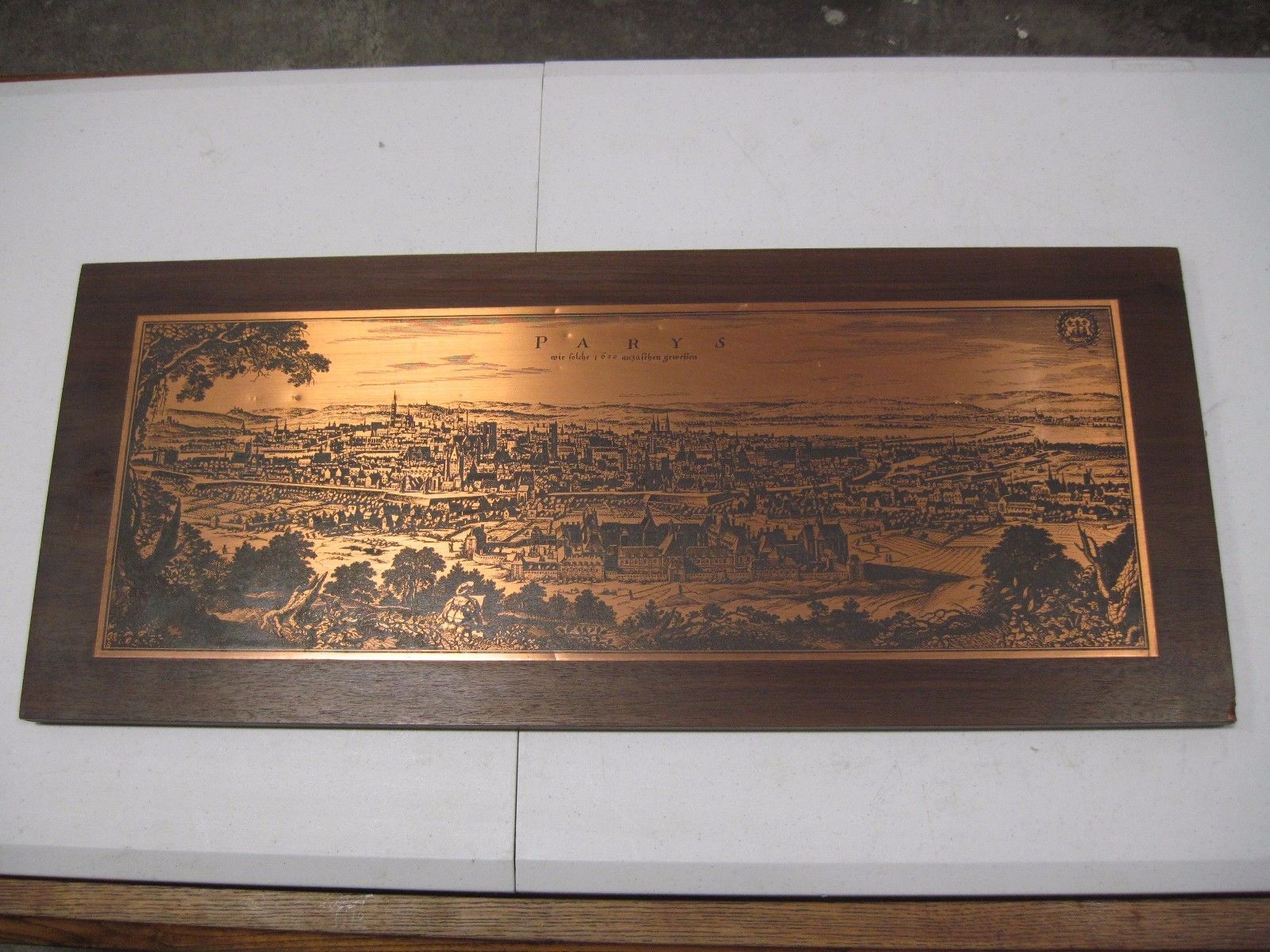 Title (ebay affiliate link): Very Large Antique Vintage Copper Etching Inlay Wood Paris 1620 City View