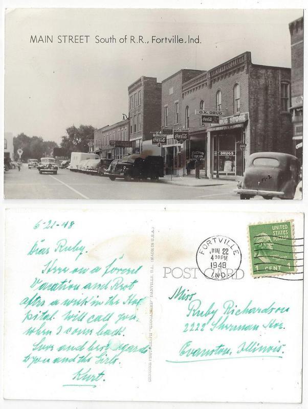 Title (ebay affiliate link): Cars Outside OK Drug Store Showing Coca Cola Signs Fortville Indiana 1948 PC