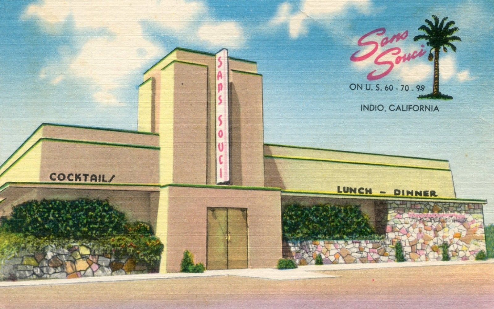 Indio California, vintage linen postcard, Sans Souci Restaurant & Cocktails