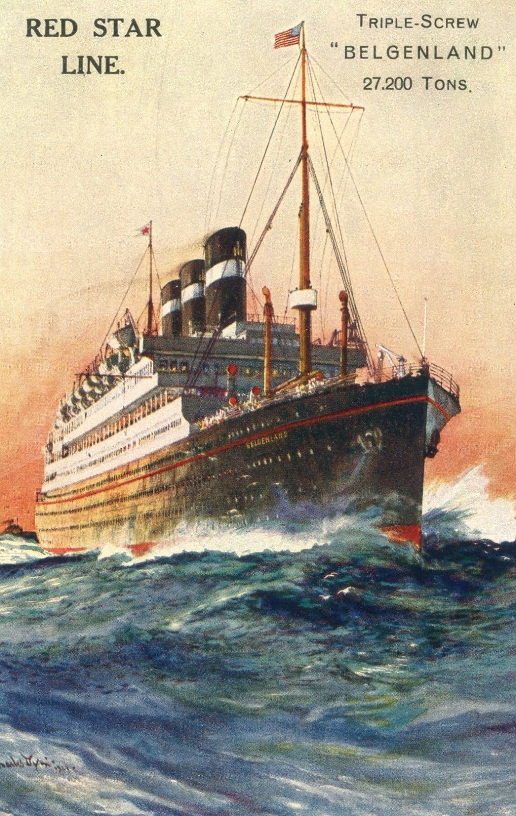 Red Star Liner "Belgenland", triple-screw, nice 1910''s artist signed postcard