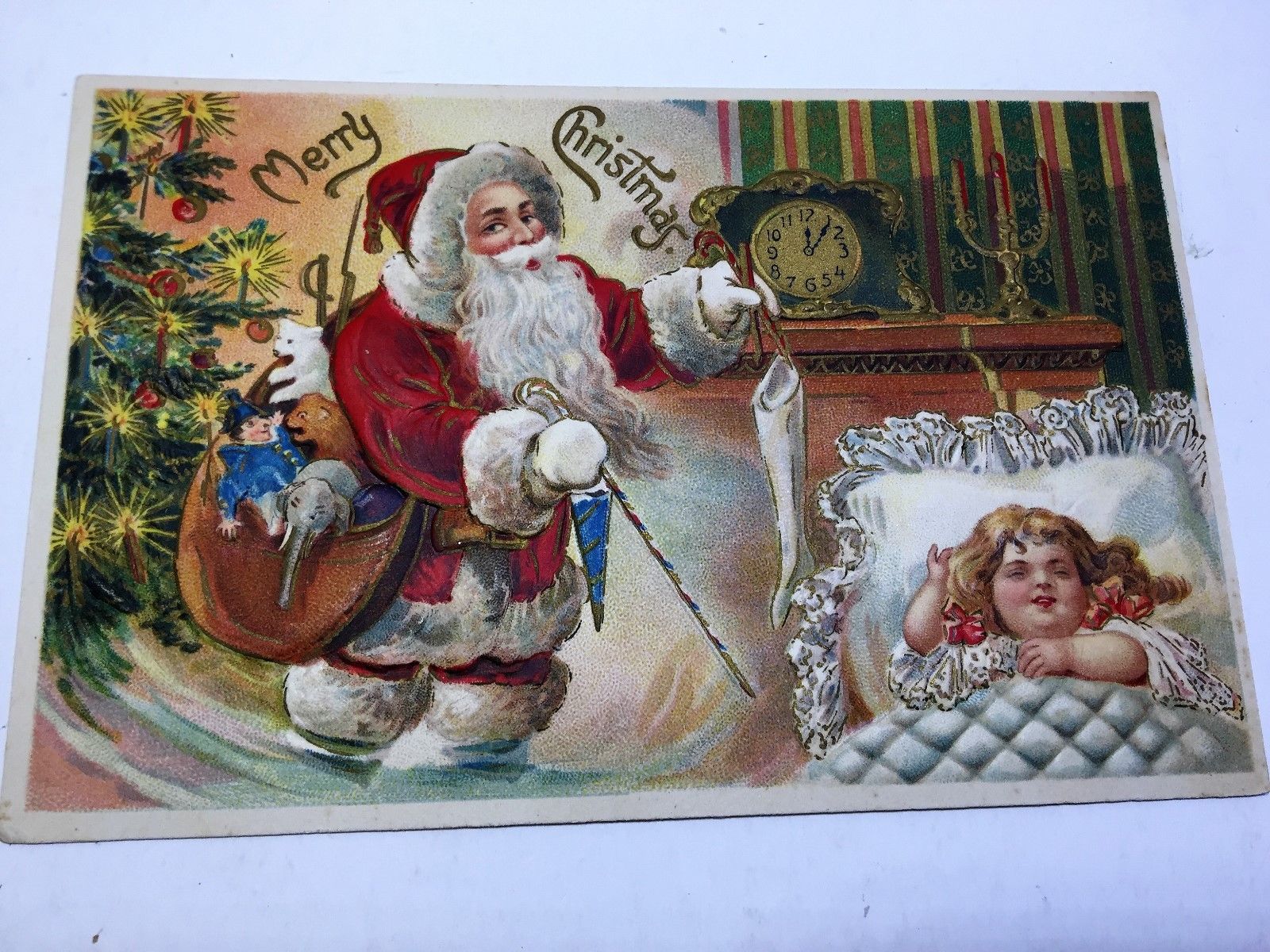 Vintage postcards, Santa and child sleeping, Christmas embossed, near MINT