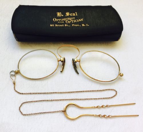 Title (ebay affiliate link): ANTIQUE Gold Tone/ Filled? Spring Bridge PINCE NEZ. Spectacles w/ Hairpin Chain