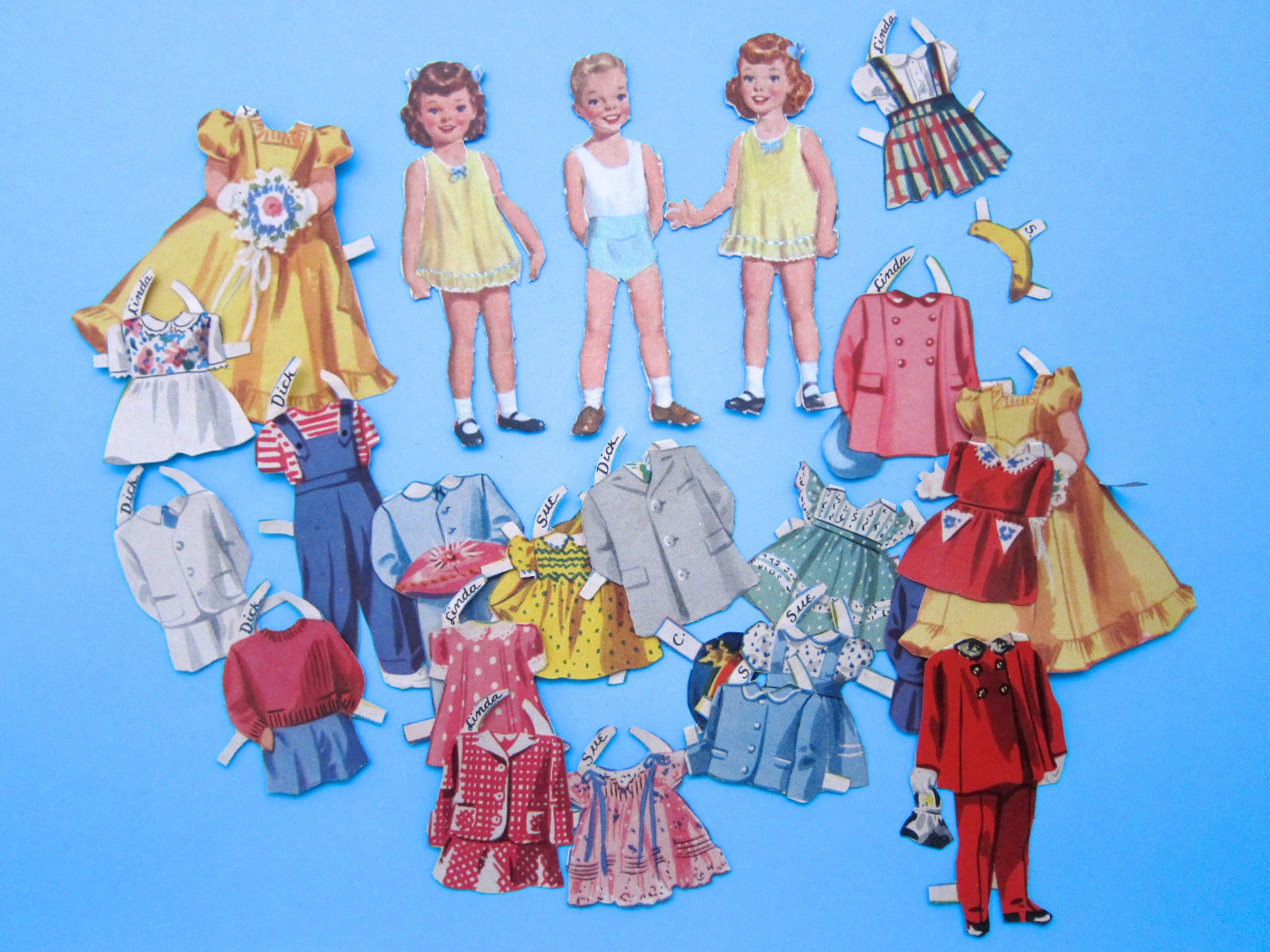 Title (ebay affiliate link): 3 Tiny Paper Dolls from 1940 Dick, Linda & Sue cut with clothes