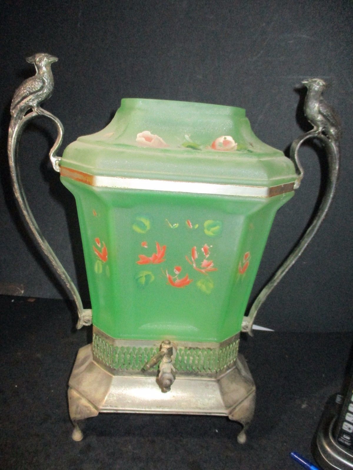1920''s SAMOVAR Glass Dispenser Green Hand painted Flowers PEACOCK F980 LK PT