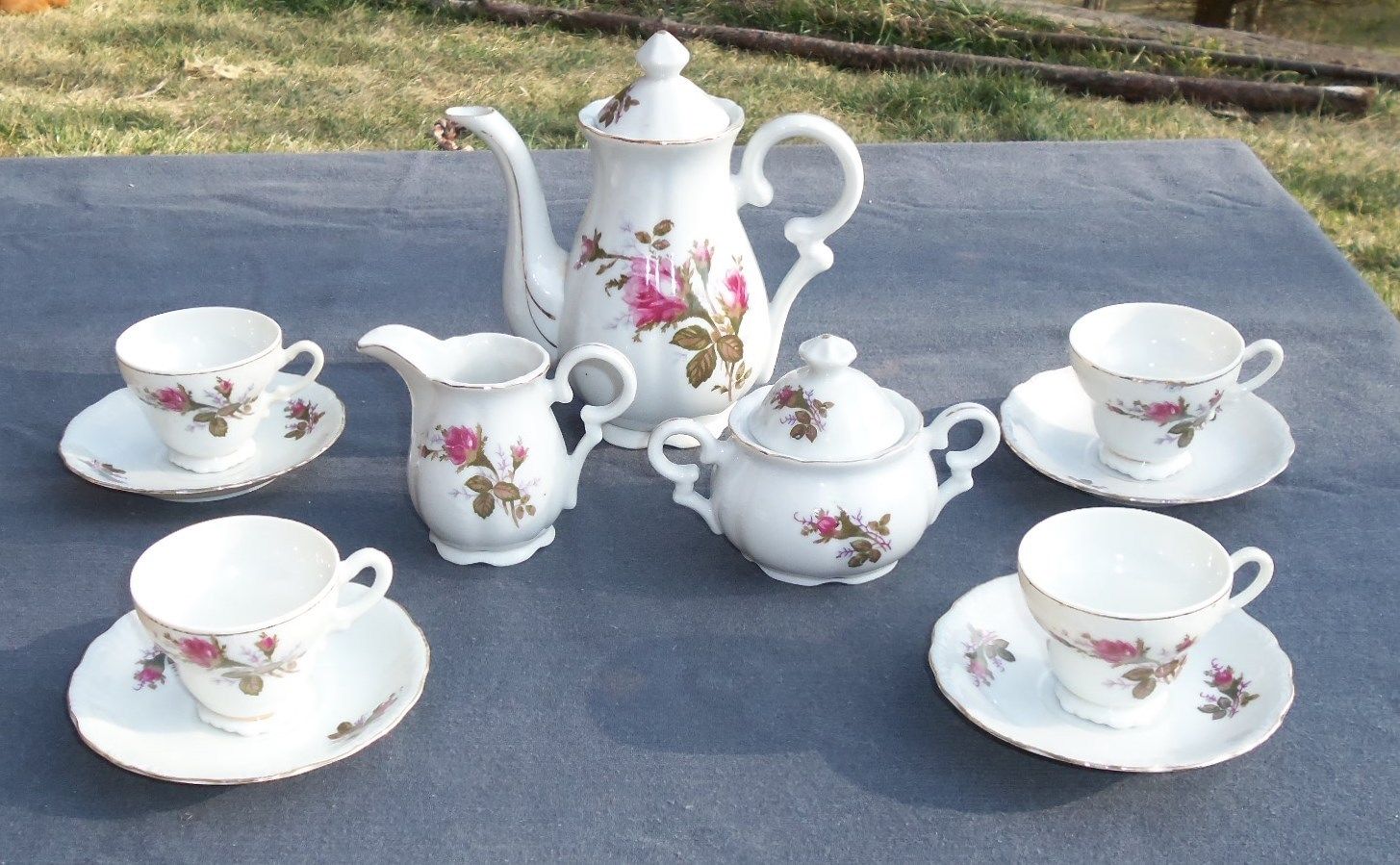 Title (ebay affiliate link): Vintage Porcelain Demitasse 13pc Tea Set. Moss Rose. Lipper Mann. Service for 4