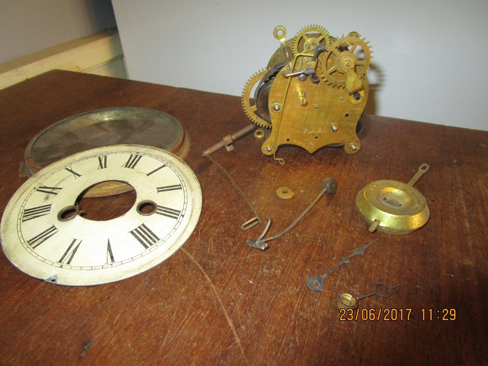 Title (ebay affiliate link): Antique gilt Brass F.H.& S Postman clock movement / F.H.& S alarm clock movement