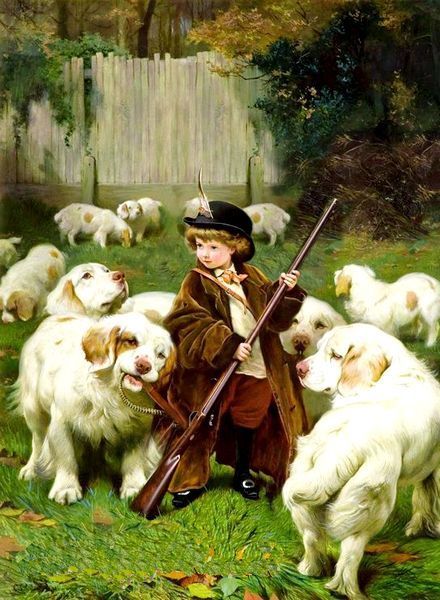 Kids LITTLE beautiful Boy and Dogs On the hunt ART BARBER 63 modern card reprint