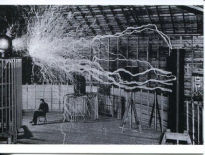 POST CARD OF A PORTRAIT OF THE GREAT INVENTOR TESLA''S ELECTRICAL EXPERIMENTS