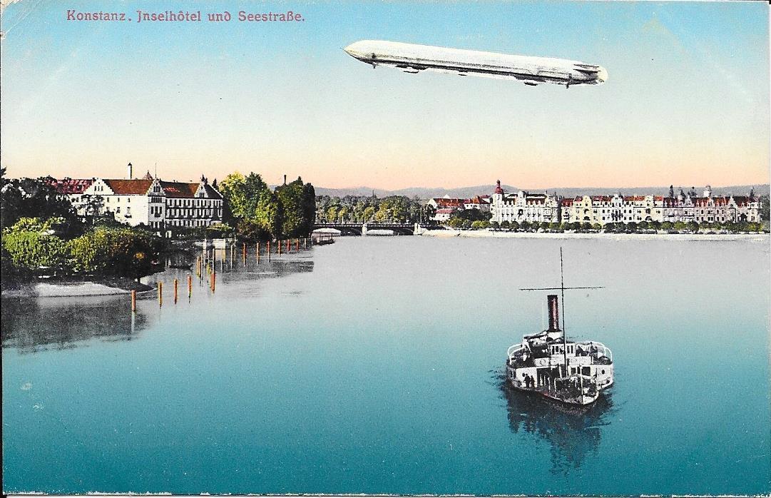 ANTIQUE 1907-1915 POSTCARD, ZEPPELIN AIRSHIP, HOTEL & SEA LANE CONSTANCE GERMANY