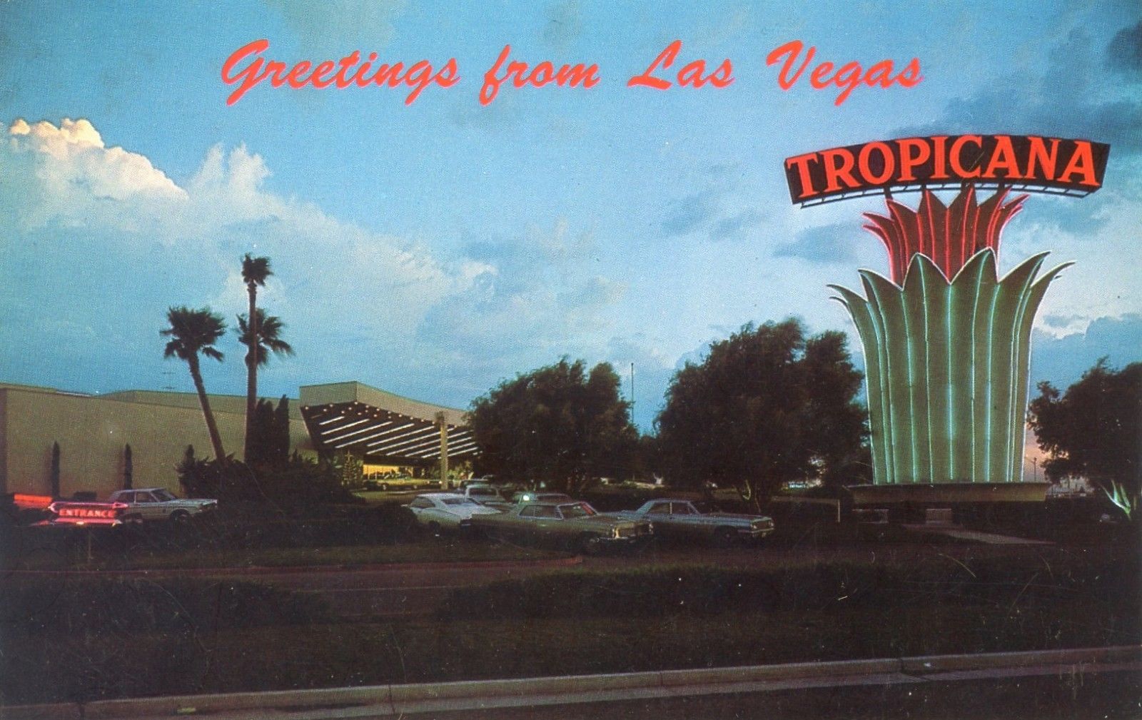 Greetings from Las Vegas Nevada, vintage postcard, Tropicana Hotel, classic cars
