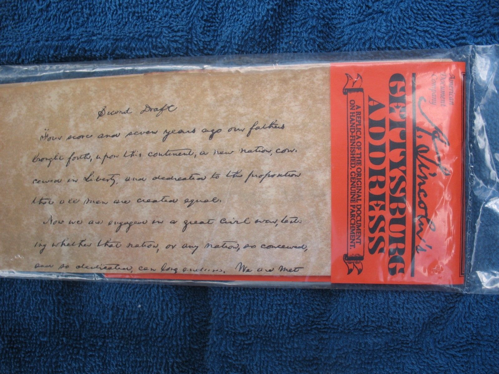 Title (ebay affiliate link): Reproduced Gettysburg Address on Reproduced Parchment