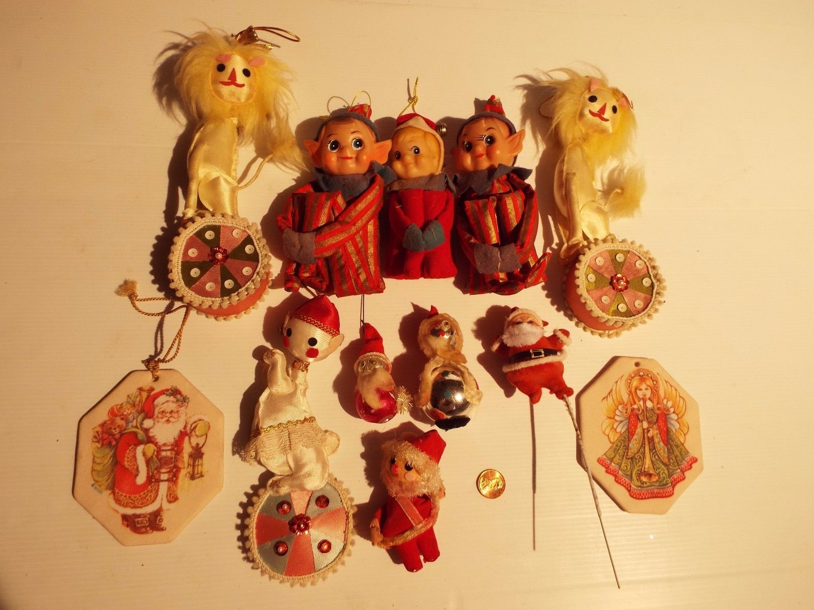 Title (ebay affiliate link): 12 Vintage Ornaments-Felt Knee Hugging Elves Felt Lions Felt Clown SANTA CLAUS