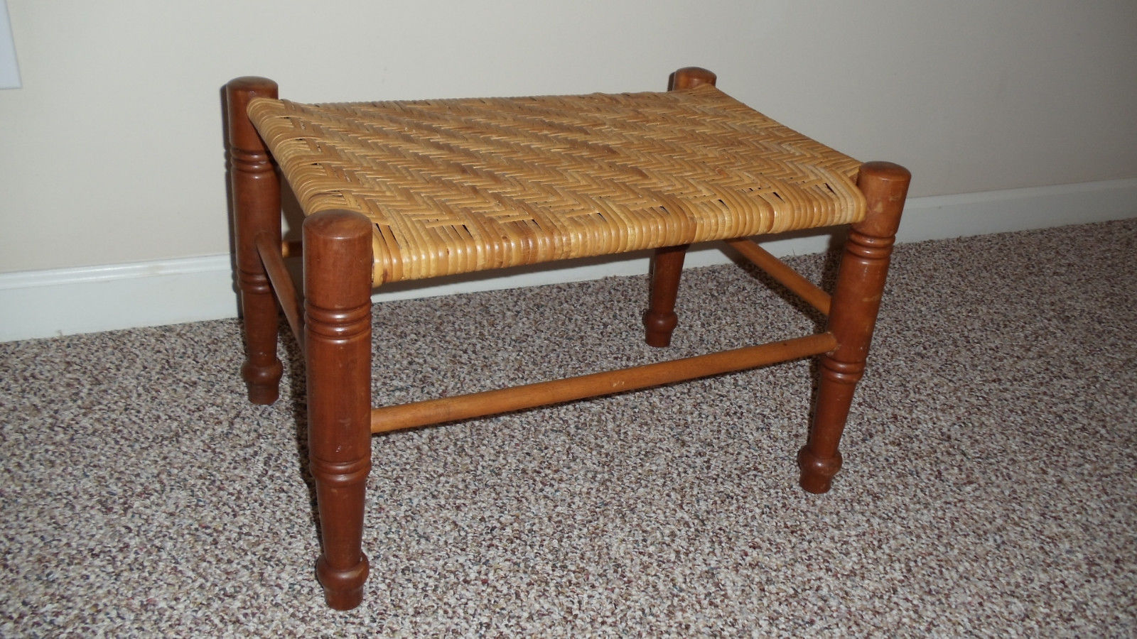 Title (ebay affiliate link): Vintage Wicker and Maple Frame Foot Stool Ottoman 22 X 15 X 14
