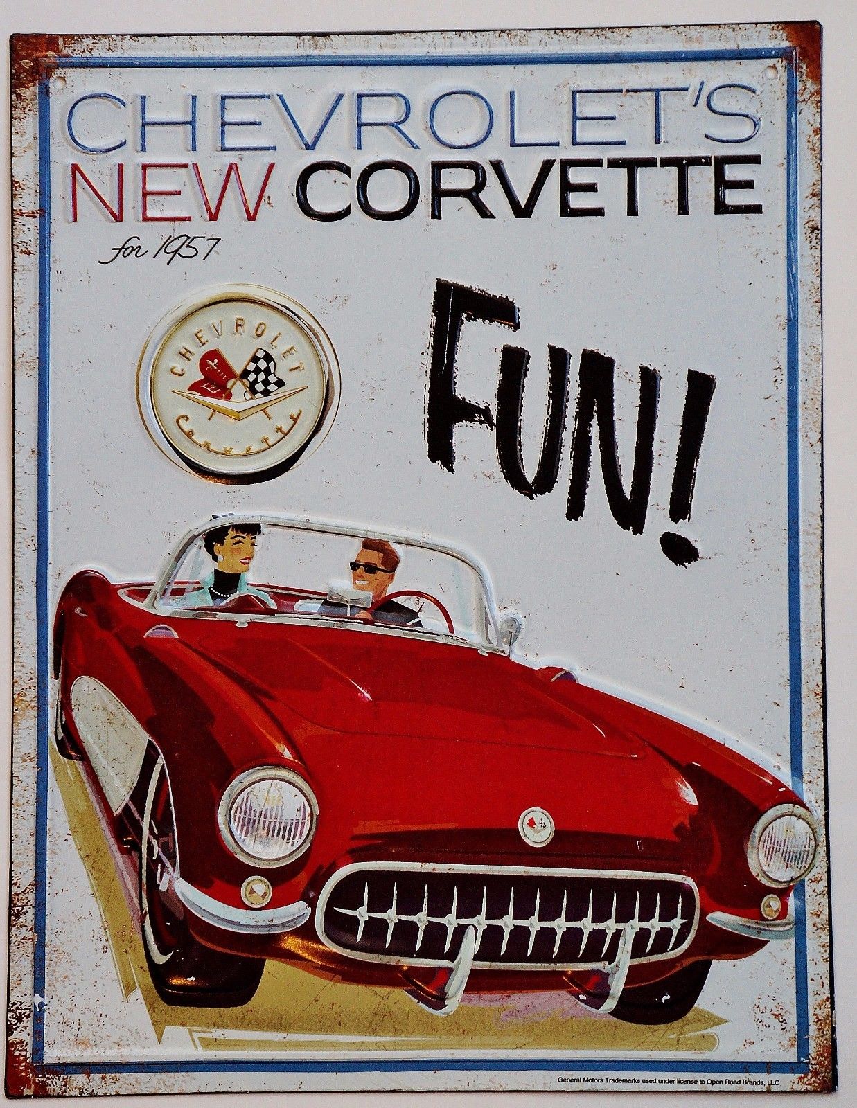 Chevrolet''s New Corvette for 1957 ~ embossed metal chevy sign ~ 10"x13"