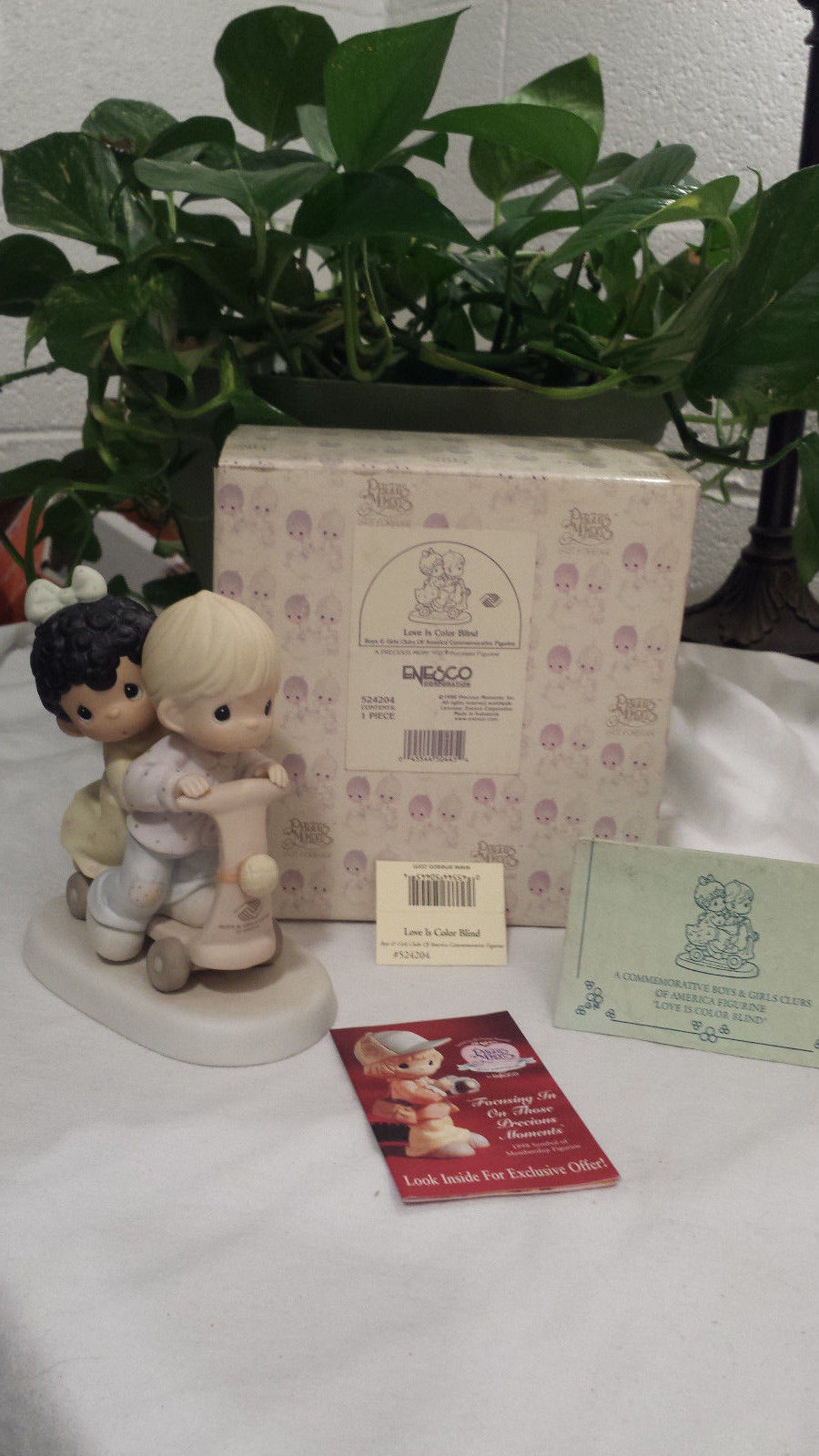 Title (ebay affiliate link): PRECIOUS MOMENTS "LOVE IS COLOR BLIND" 524204 BOY & GIRL RIDING ON SCOOTER/$75