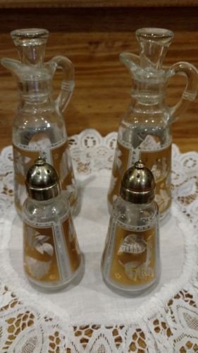 Title (ebay affiliate link): VINTAGE CRUETS AND SALT & PEPPER SHAKERS/with all tops ~ Gold with Leaves (RARE)