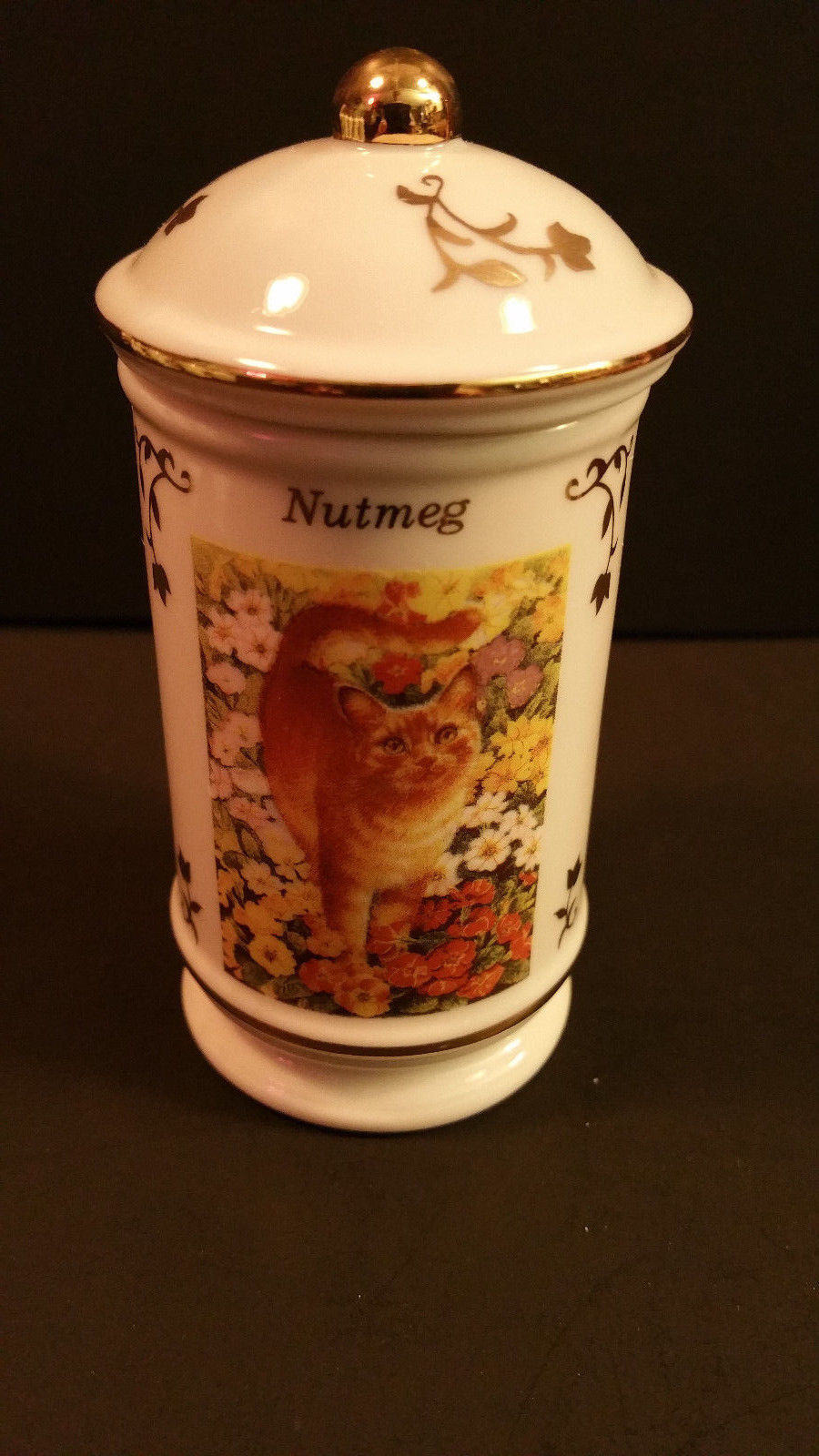 Title (ebay affiliate link): Lenox Cats of Distinction Nutmeg Spice Jar Ginger cat flower background 1995