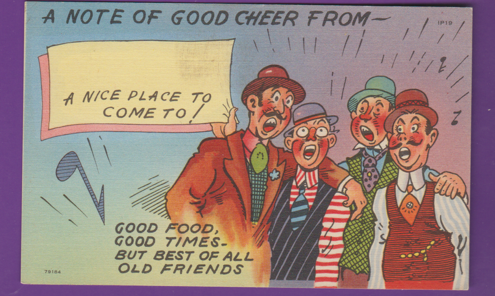 Comic linen postcard/ 4 men singing/ "note of good cheer from..."/ friends