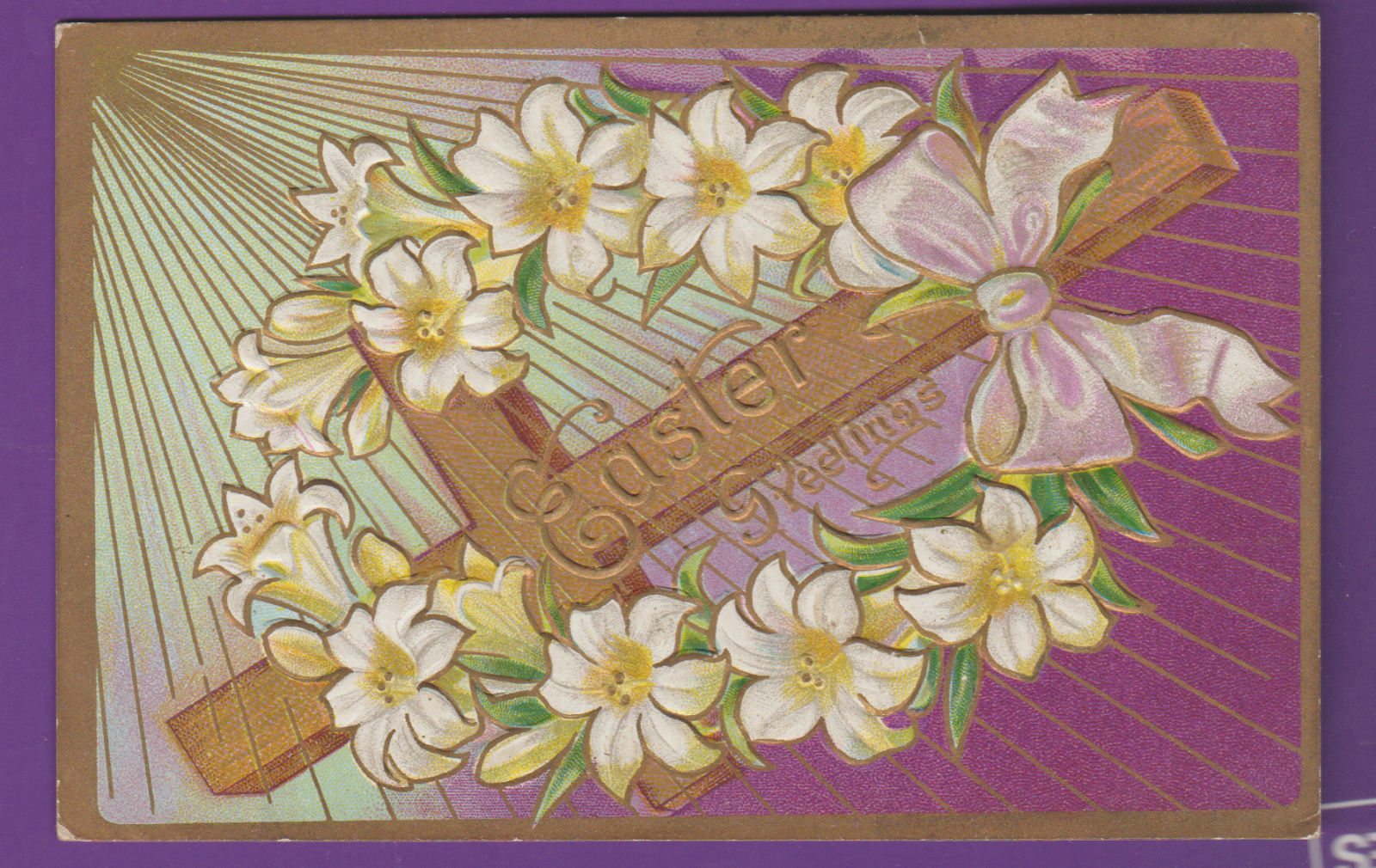 Title (ebay affiliate link): Easter embossed postcard/ gold cross/ white lilies/ purple corner/ gilded