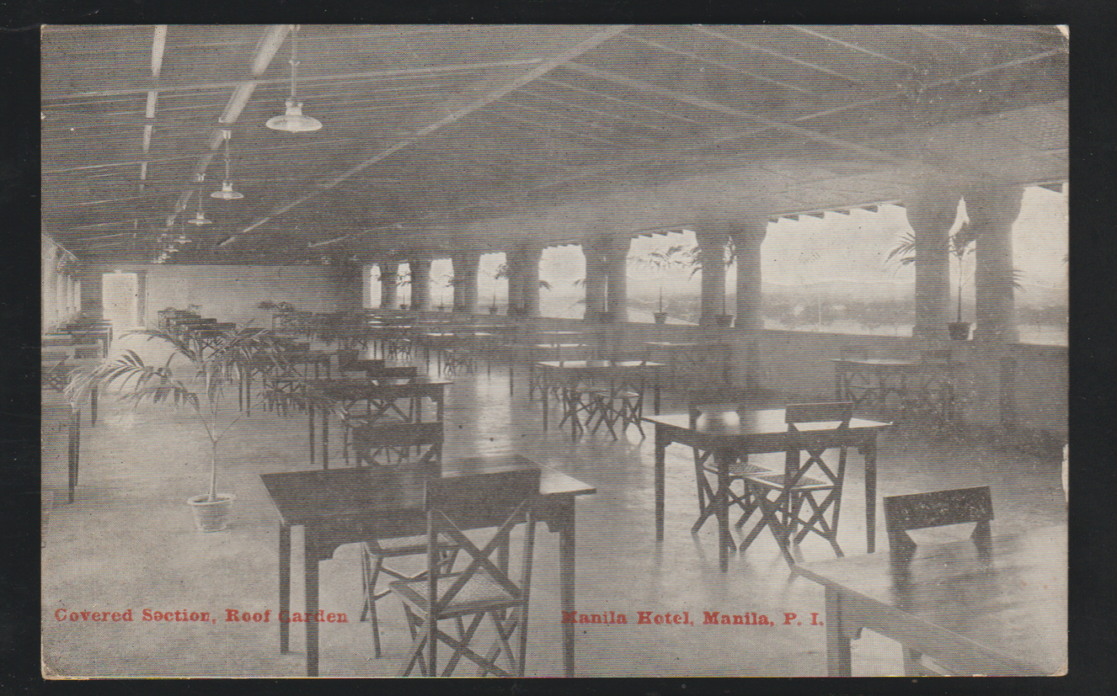 Title (ebay affiliate link): Manila, P.I/ Manila Hotel/ covered section of the roof garden/ vintage postcard