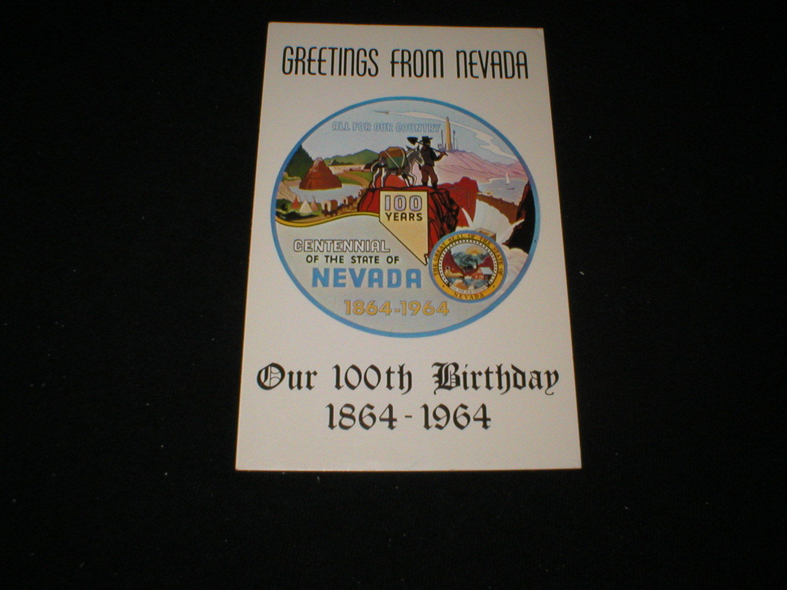 Title (ebay affiliate link): GREETINGS FROM NEVADA ~ !00th Birthday Official Seal Postcard- 1964