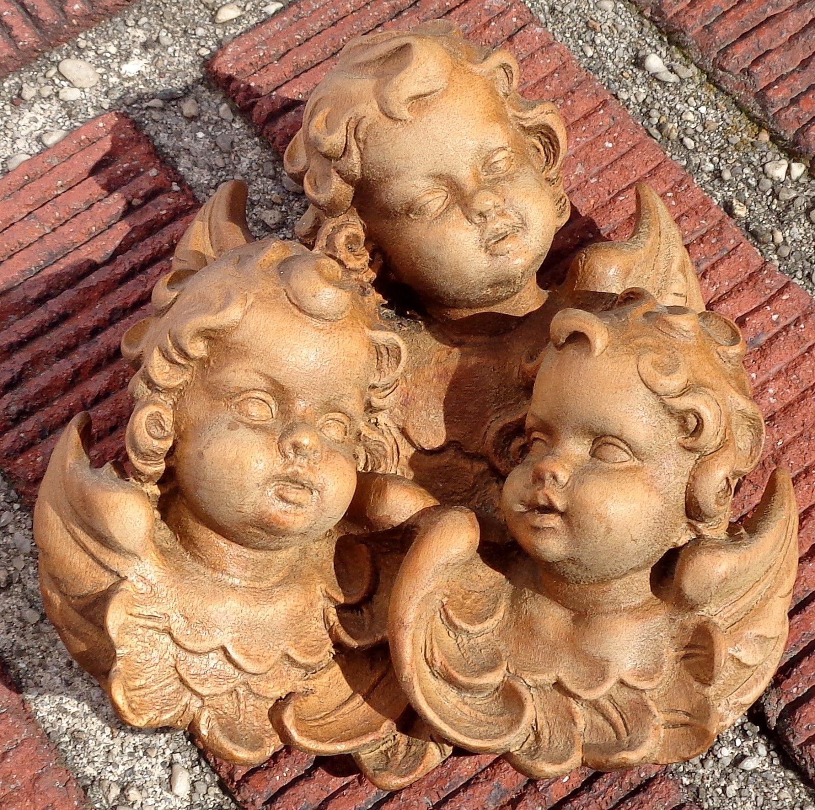 Vintage German Carved Wood Triple Cherubs Angels Wall Mount