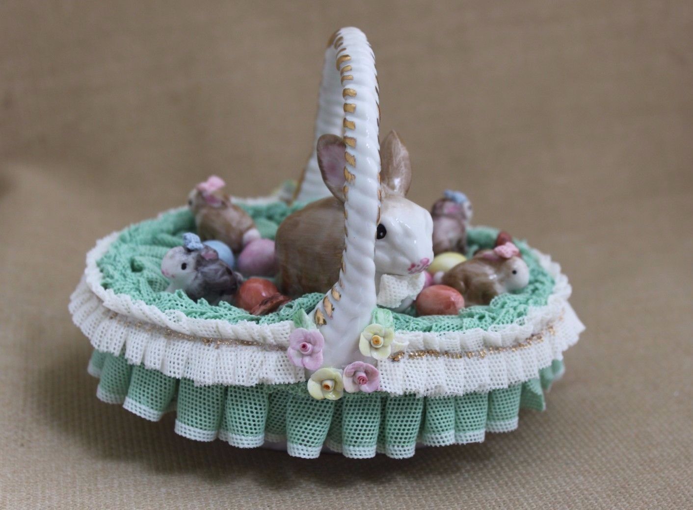 MZ Irish Dresden Lace Porcelain Easter Basket with Bunnies and Eggs