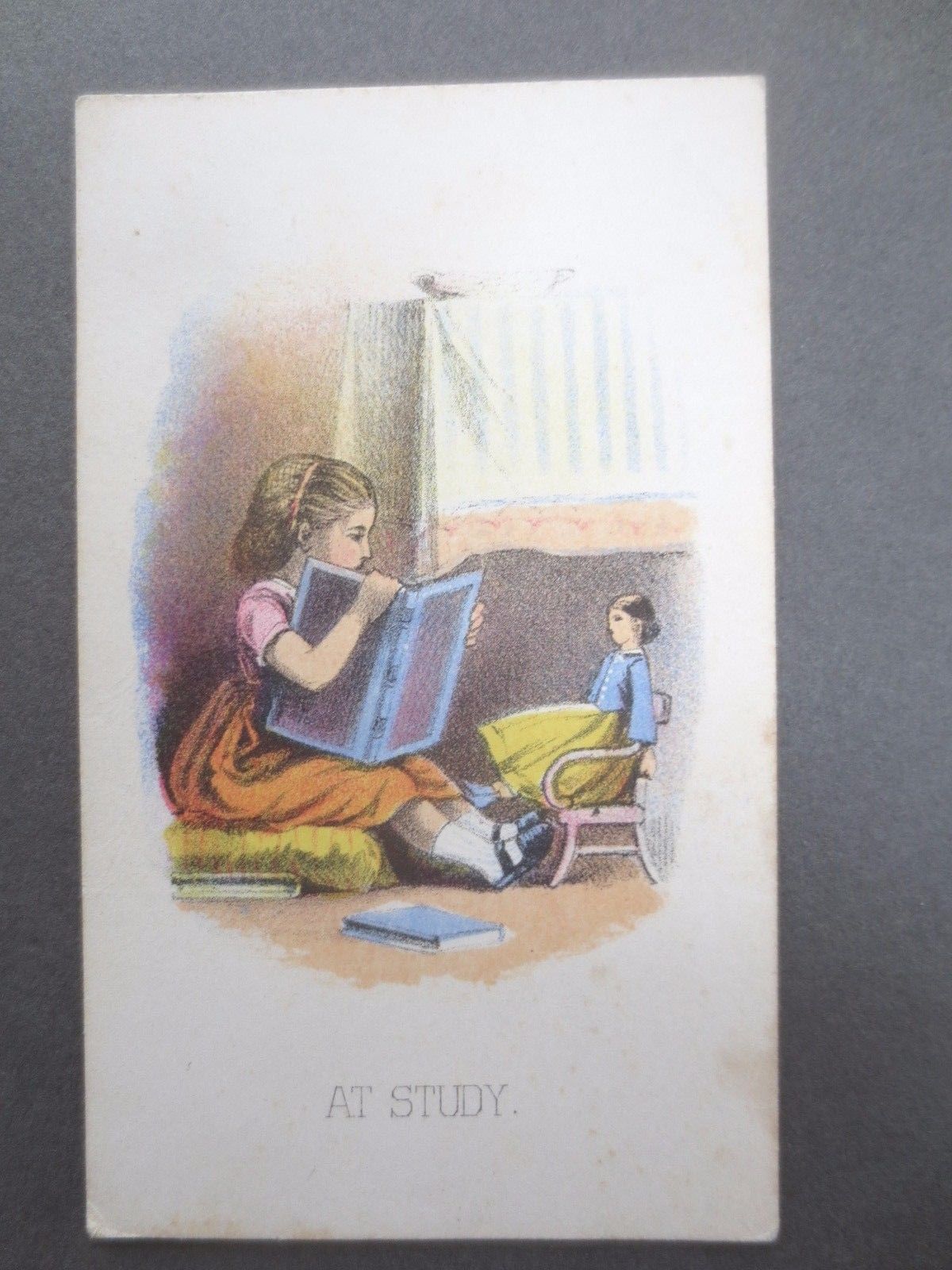 Title (ebay affiliate link): Antique Victorian Greetings Card Little Girl Reading Book to Doll Chromo Litho
