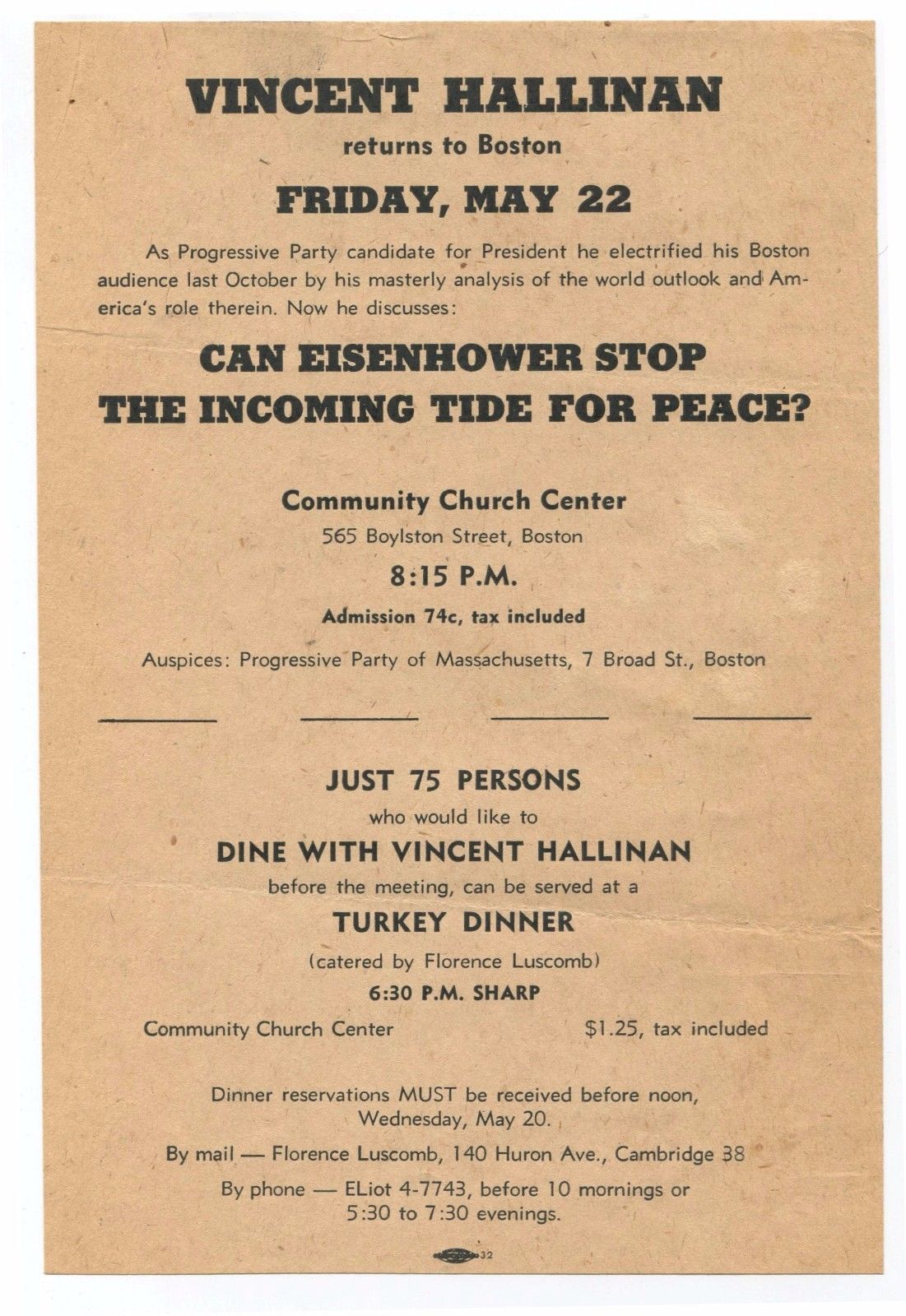 1953 Leaflet Announcing Progressive Party Presidential Candidate Boston Speech