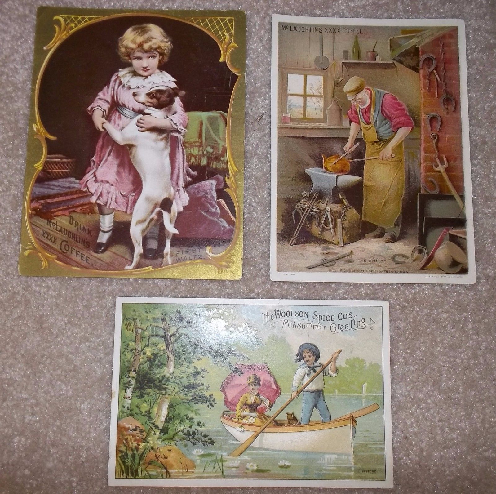 victorian trade cards - lot of 3 large coffee cards - Woolson Lion, McLaughlin''s