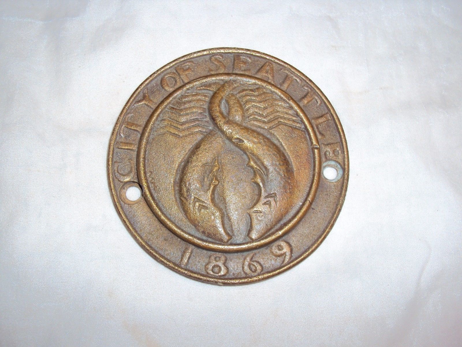 Title (ebay affiliate link): VINTAGE 1869 CITY OF SEATTLE BRONZE STREET LAMP LIGHT POLE BADGE MEDALLION