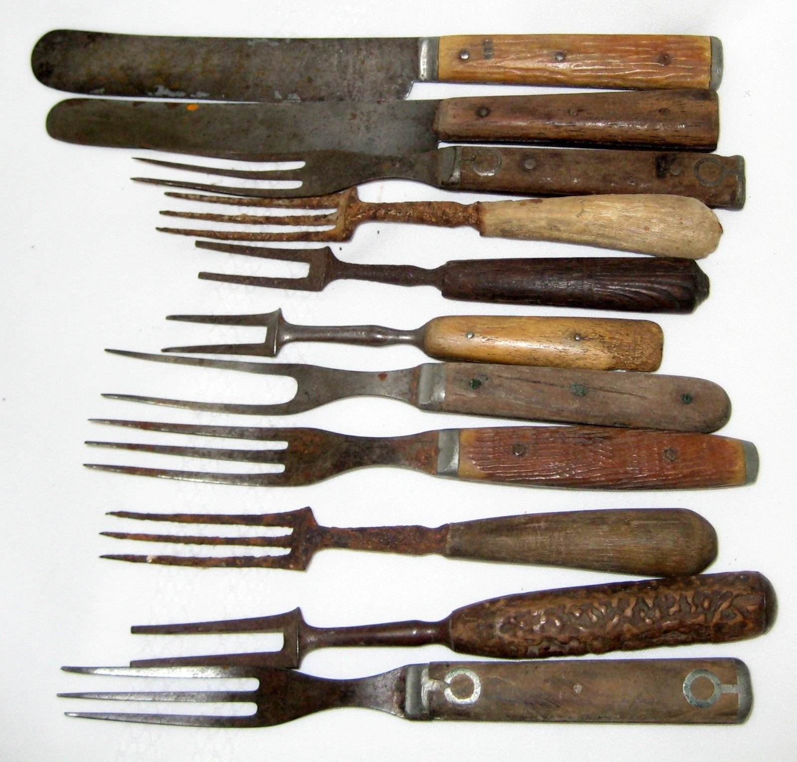 Title (ebay affiliate link): 11 PRIMITIVE ANTIQUE CARVING CUTLERY 2 - 3 TINE FORKS KNIVES WOOD ANTLER HANDLES