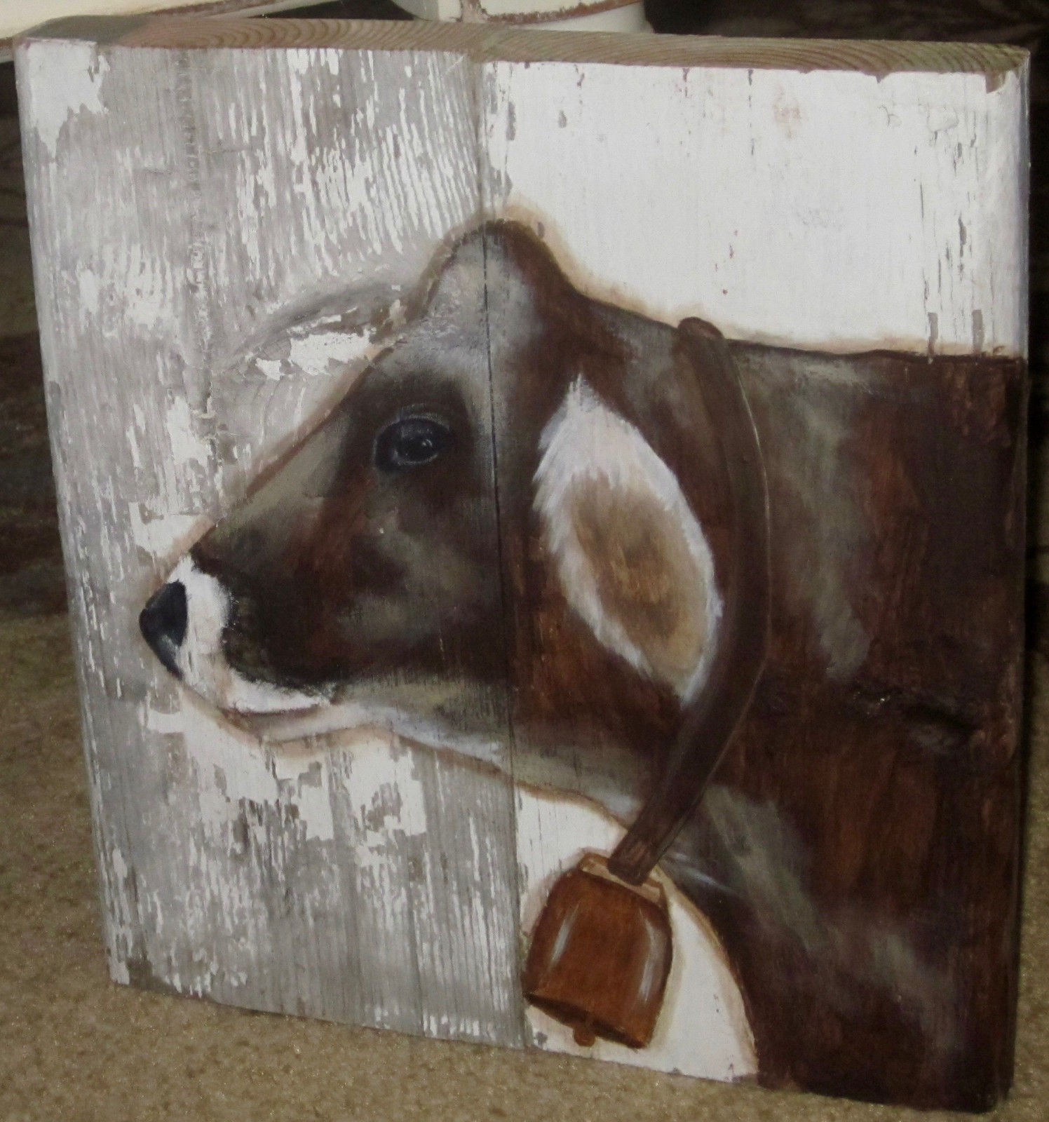Title (ebay affiliate link): *~*PRIMITIVE*~* HP FOLK ART PRIM COW *~* COW BELL *~* OLD RECLAIMED WOOD