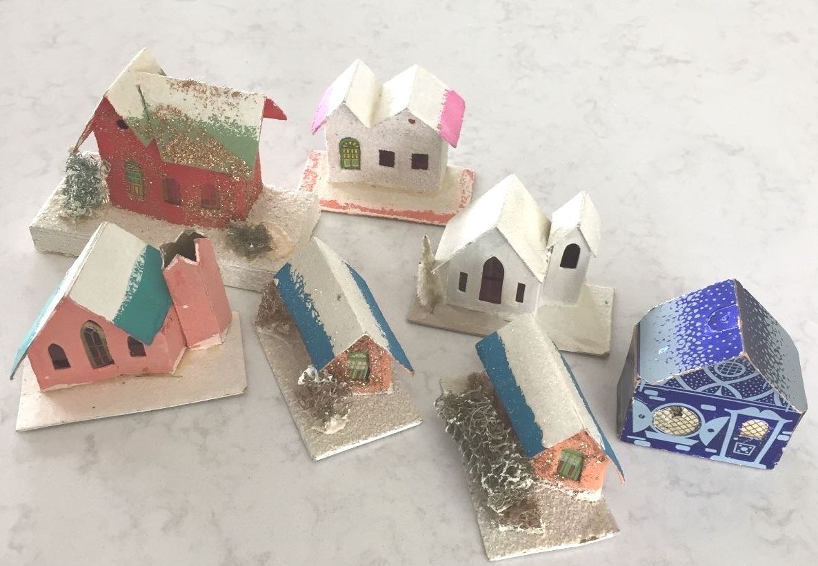 Title (ebay affiliate link): 7 Antique Vintage CHRISTMAS PUTZ FLOCKED CARDBOARD HOUSES & CHURCH !!
