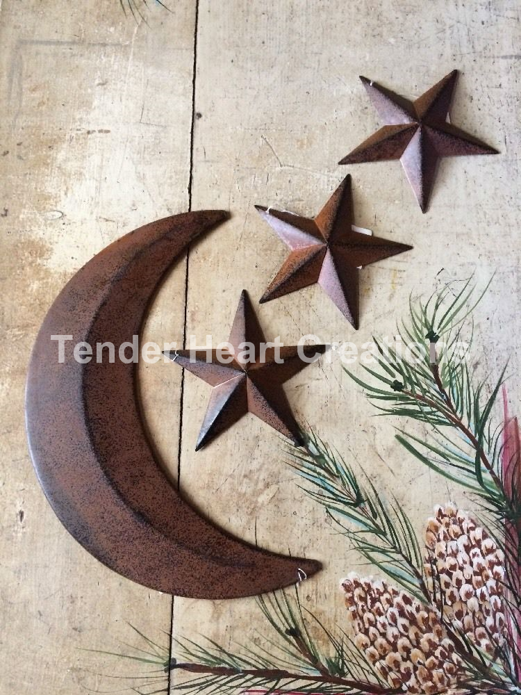 Title (ebay affiliate link): (SET) 12" Moon & 3 Rust & Black Barn Stars 5.5" Distressed Tin Primitive Country