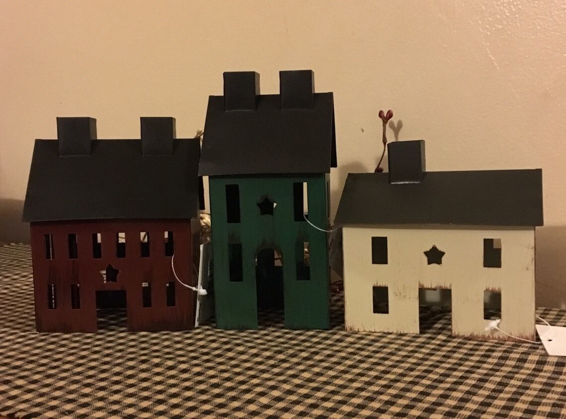 Title (ebay affiliate link): PRIMITIVE SALT BOX HOUSE SET TIN NO WOOD COUNTRY FARMHOUSE DECOR NEW W/ TAGS
