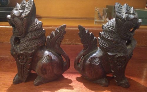 Hand carved wooden dragons. 6 3/4 inches tall comes in a pair.