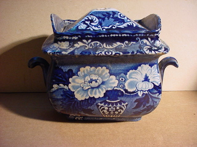 c1835 Dark Blue Staffordshire Sugar Bowl, Vase & Flowers, AS IS