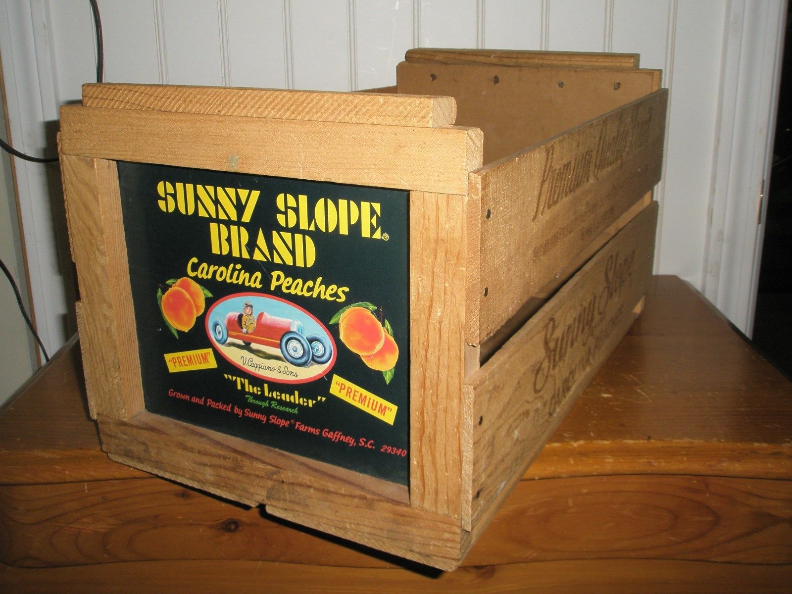 Title (ebay affiliate link): OLD WOOD WOODEN SUNNY SLOPE BRAND PEACHES CAROLINA PRODUCE CRATE BOX ADVERTISING