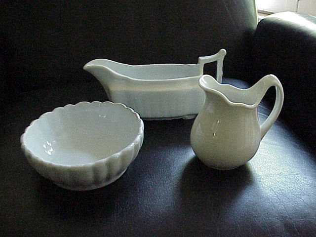 ANTIQUE WHITE IRONSTONE BOWL, GRAVY, CREAMER