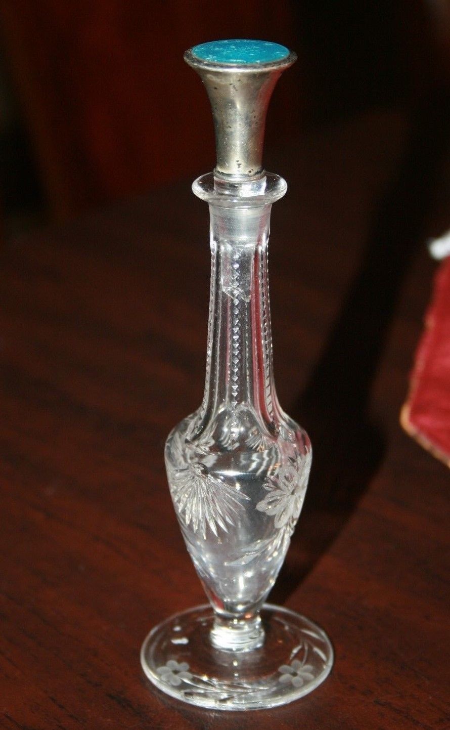 Title (ebay affiliate link): Antique Sterling w/ Guilloche enamel top Glass perfume bottle Estate pce. signed
