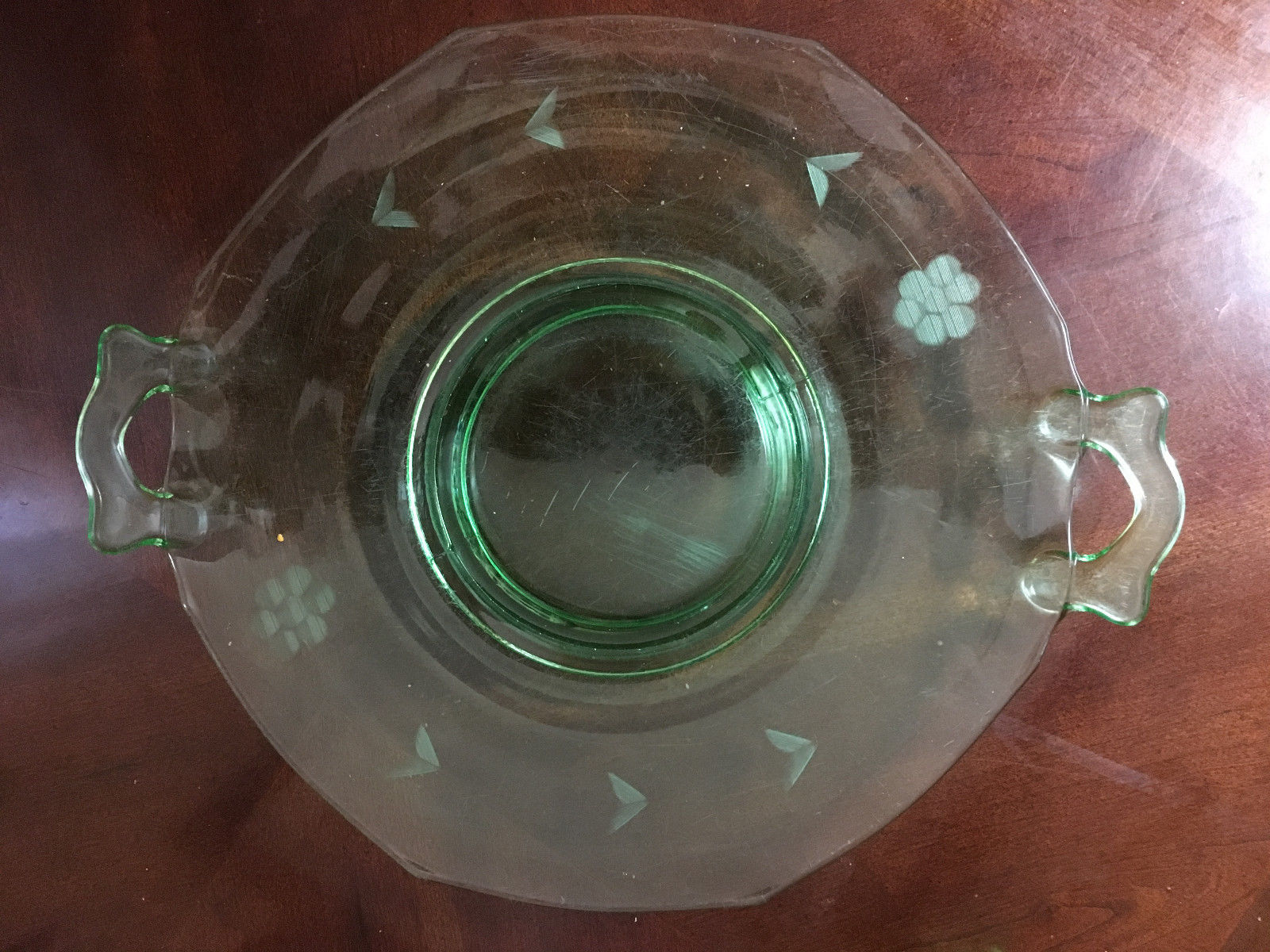 Title (ebay affiliate link): GREEN DEPRESSION GLASS SERVING PLATE WITH OPEN HANDLES