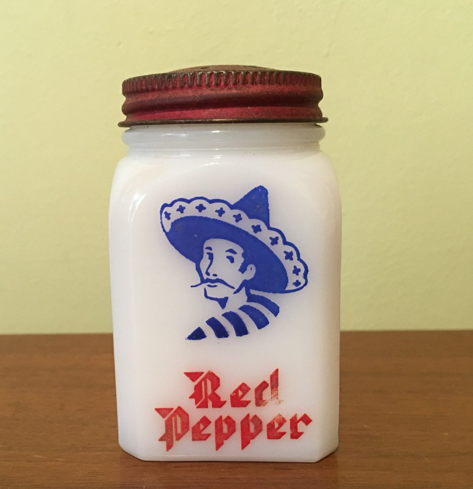 Title (ebay affiliate link): Vintage Milk Glass Dove RED PEPPER Spice Jar Shaker w Mexican Man