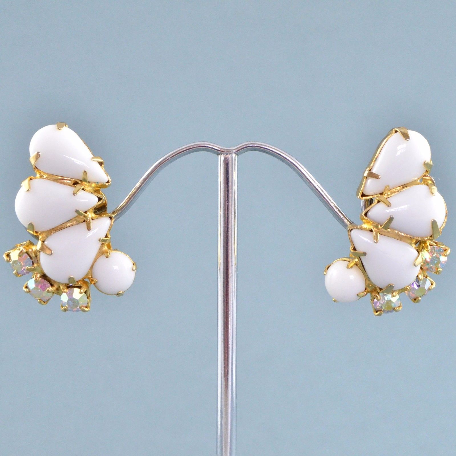 Title (ebay affiliate link): Vintage Earrings 1950s Milk Glass & Aurora Borealis Goldtone Bridal Jewellery