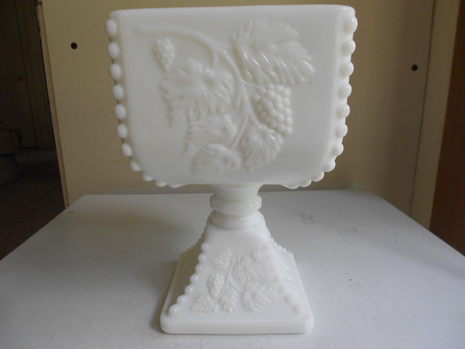 Title (ebay affiliate link): VINTAGE WHITE MILK GLASS PEDESTAL SQUARE COMPOTE ~ GRAPE & LEAF PATTERN
