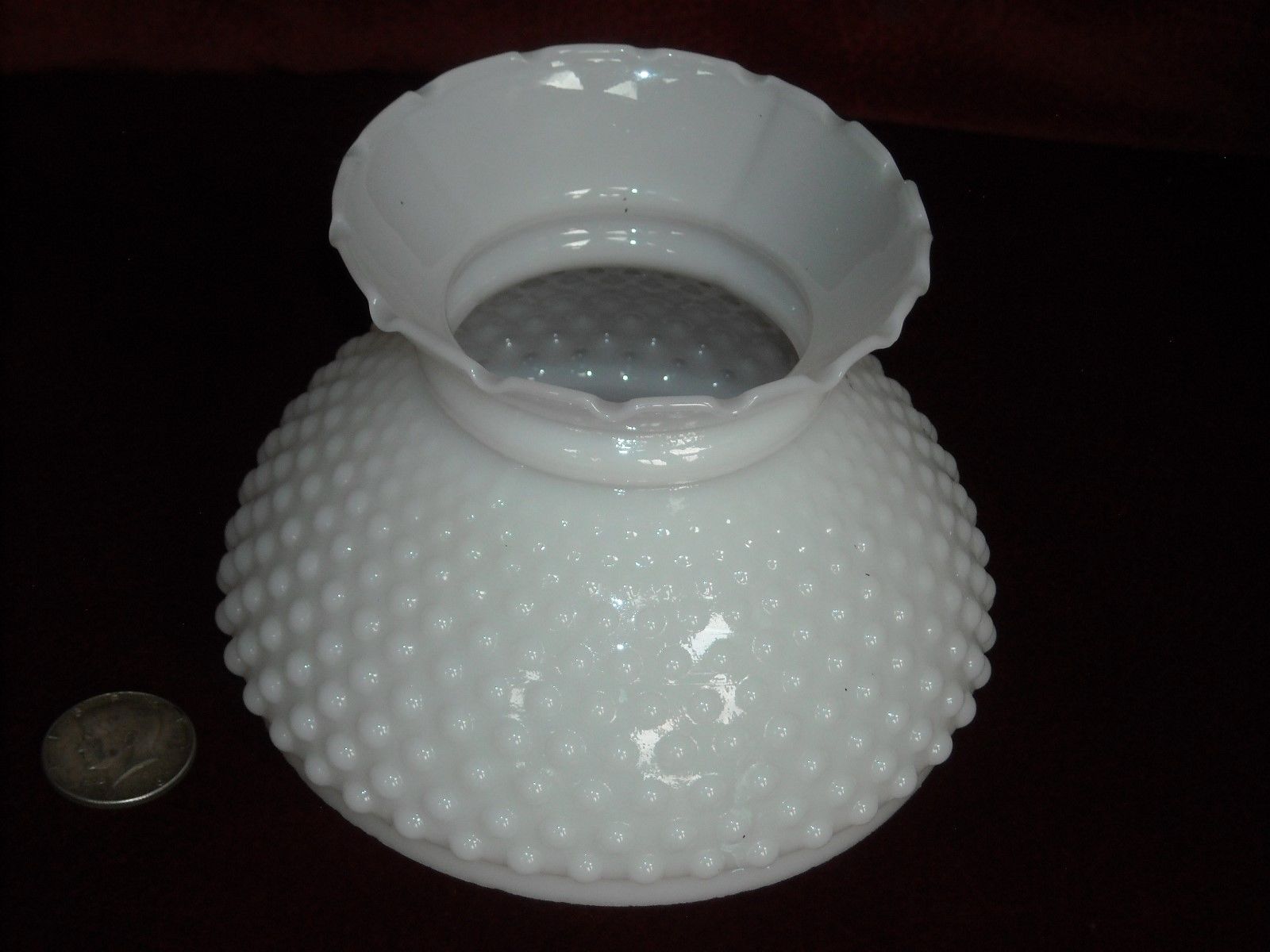 Title (ebay affiliate link): SMALLER WHITE MILK GLASS HOBNAIL STUDENT LAMP SHADE, FENTON ?? 6" FITTER