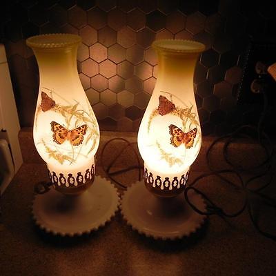 #1289 Set of 2 vintage White Milk Glass handpainted Butterfly Hurrcane Lamps Old
