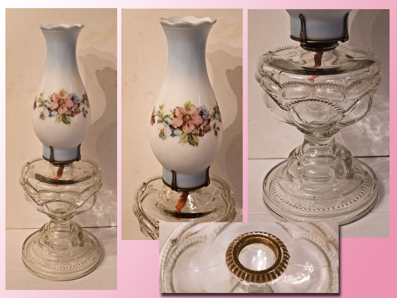 FINE VINTAGE 2 MOLD PRESSED GLASS OIL LAMP W/A HAND DECORATED MILK GLASS CHIMNEY