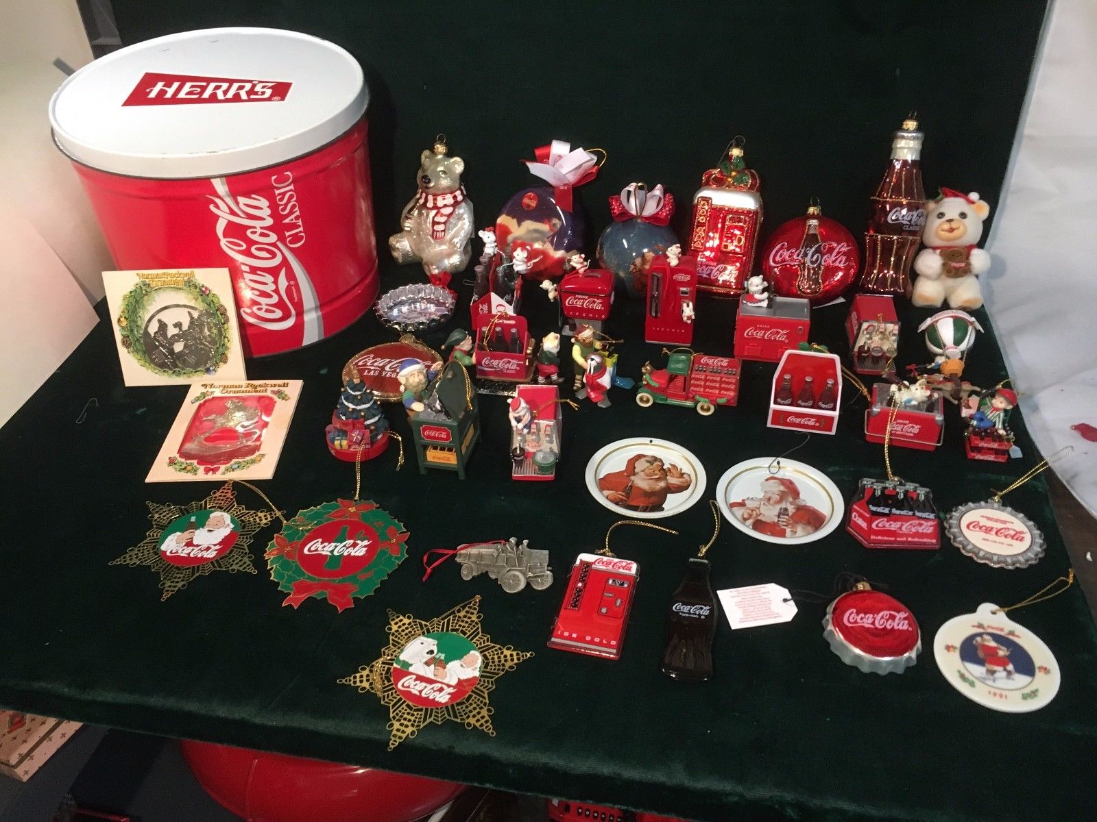 Title (ebay affiliate link): Box Lot of 38 Coca-Cola Christmas Ornaments in Coke Tin